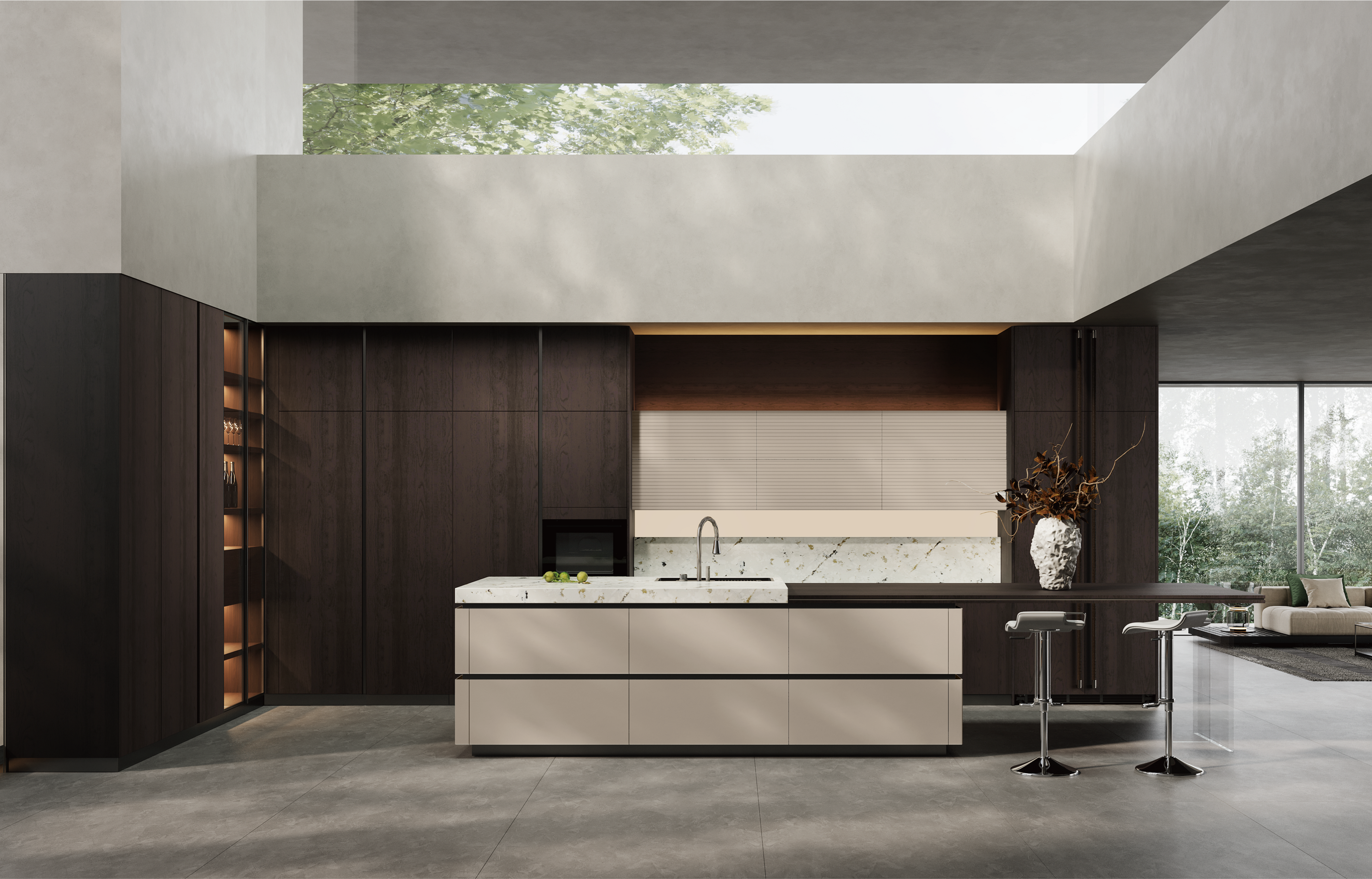 通过3044am永利厨柜量体裁柜,定制出适合主厨下厨的烹饪区和洗涤区的舒适高度。